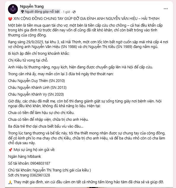 Trong lúc tang thương và bế tắc này, tôi tha thiết mong nhận được sự chung tay của cộng đồng, để có kinh phí lo ma chay cho chị Kiều, chữa trị cho anh Hiệu, và để ba cháu nhỏ còn có cha làm chỗ dựa sau này.