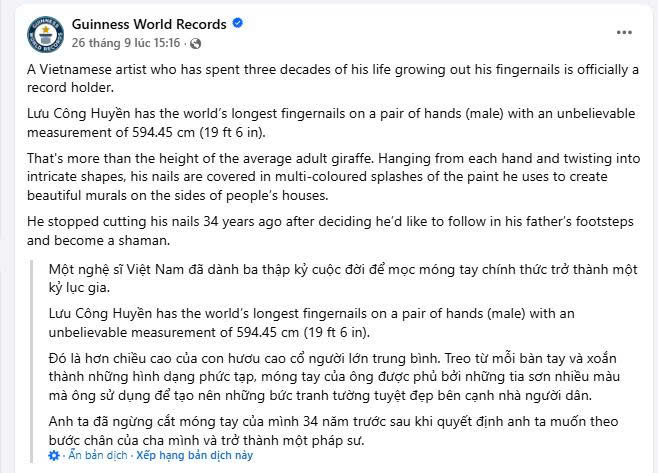 Vừa qua tổ chức Kỷ lục gia Guinness thế giới chính thức công nhận ông Huyền là người có bộ móng tay dài nhất thế giới