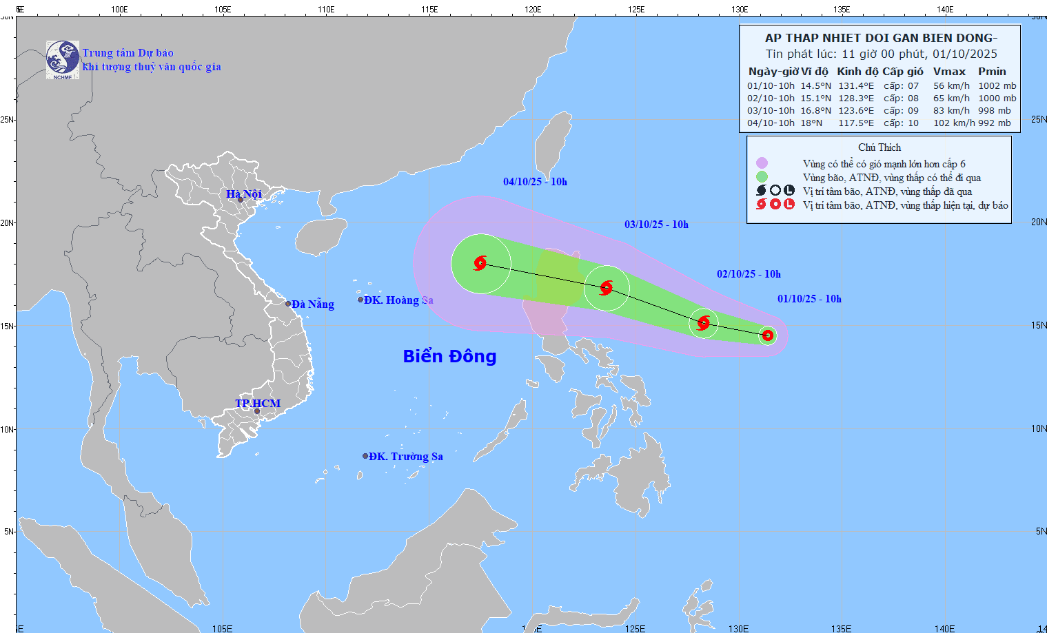 Các chuyên gia khí tượng nhận định, qua đánh giá hiện trạng và phân tích dự báo, hiện nay áp thấp nhiệt đới ở ngoài vùng biển phía Đông Philippines có khả năng mạnh lên thành bão trong 24 giờ tới. Sau đó, bão vượt qua phía Bắc đảo Lu-Dông (Philippines) và sẽ đi vào Biển Đông trong khoảng chiều đến tối ngày 3/10.